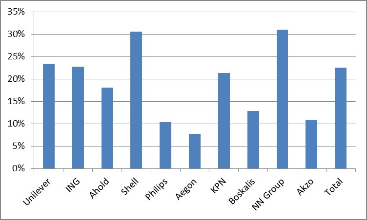 Als we kijken naar AEX-bedrijven dan zien we het volgende beeld. Bij Shell (31 procent) en NN Group (31 procent) is het deel van aandeelhouders uit landen waar voordeel te behalen is uit de afschaffing van de dividendbelasting vrij groot, met name de vestiging in het Verenigd Koninkrijk. Bij andere beursgenoteerde bedrijven ligt dit percentage iets lager, maar nog altijd tussen 8 procent (Aegon) en 23 procent (Unilever). Het gewogen gemiddelde is 23 procent.