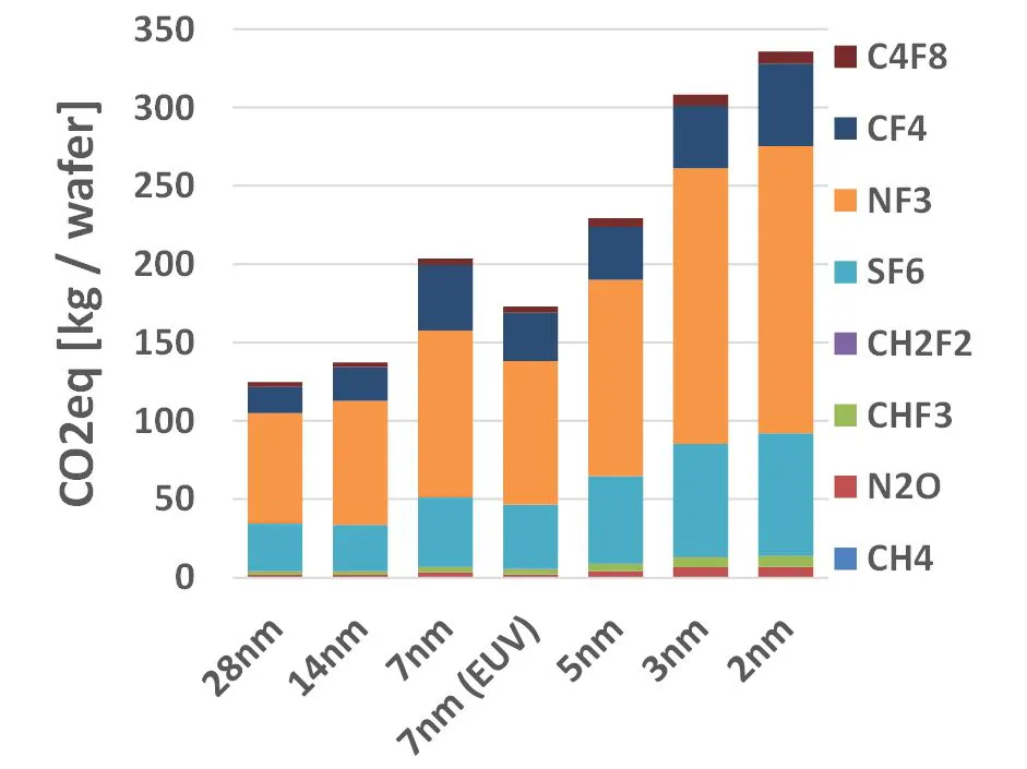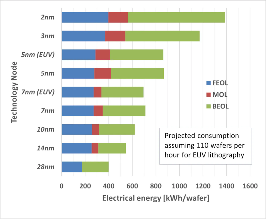 Als we uitgaan van een stuk siliciumschijf (wafer) van dezelfde grootte voor een computerchip, dan vereist de modernste 2nm-procestechnologie aanzienlijk meer elektriciteit (x3,5) en ultrazuiver water (x2,3) voor de productie in vergelijking met de oudere 28nm-technologie. De uitstoot van broeikasgassen (in CO2-equivalenten) neemt toe met een factor 2,5 (per computerchip).(*2)