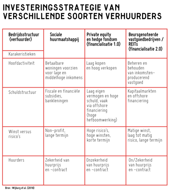 Fields (2015) geeft enkele voorbeelden van hoe private-equitybedrijven in New York opereren. Zo verwierf de in Los Angeles gevestigde participatiemaatschappij Milbank bijvoorbeeld in 2007 18 gebouwen in de Bronx voor 35 miljoen dollar. De overname werd mogelijk gemaakt door een lening van Deutsche Bank die vervolgens werd gesecuritiseerd. LaSalle Bank opereerde als de trust voor de securitisatie en verkocht de lening in 2008 aan Wells Fargo. Toen Milbank een jaar later in gebreke bleef, werd de dienstverleningsovereenkomst overgedragen aan een dochteronderneming van het bouwbedrijf Lennar Corporation, genaamd LNR Partners. Inmiddels zijn de gebouwen verslechterd en hebben huurders en maatschappelijke organisaties de verhuurder voor de rechter gedaagd. LNR was echter niet bereid of in staat om de reparaties uit te voeren die door de rechtbank waren bevolen en die LNR ertoe heeft aangezet de gebouwen te verkopen aan een verhuurder die bereid en in staat is om de vereiste reparaties uit te voeren (Teresa, 2016). In 2011 heeft Finkelstein Timberger East Real Estate, een onroerend-goedeigenaar en -beheerder, de gebouwen voor iets minder dan 28 miljoen dollar verworven en de rechtbank beloofd om de nodige reparaties uit te voeren en tegelijkertijd de huurverhogingen te beperken, waarmee de transformatie van financialisering 1.0 naar 2.0 wordt gemarkeerd. In 2012 werd Milbank failliet verklaard. In Duitsland vond in het hele land privatisering en financialisering plaats, zowel in de voormalige DDR (‘Oost’) als in de BRD (‘West’). In de staat Berlijn werden tussen 1990 en 2005 212.000 sociale woningen geprivatiseerd (Aalbers en Holm, 2008). Niet alleen verkochten de 19 verschillende sociale huisvestingsmaatschappijen duizenden eenheden, twee bedrijven werden volledig geprivatiseerd (GSW en Gehag, met een gecombineerd woningbestand van meer dan 100.000 eenheden). Met de aankoop in 2004 van GSW en haar 65.000 eenheden werd Cerberus, een Amerikaans private-equityfonds ter waarde van 24 miljard dollar, de grootste verhuurder van Berlijn. Voor een prijs van €405 miljoen kon Cerberus de aandelen kopen voor slechts €6.230 per wooneenheid, hoewel Cerberus ook de schuld van GSW op zich nam. De onderneming verwierf nog eens 30.000 eenheden in minstens negen andere transacties (Aalbers en Holm, 2008). Cerberus werd ondersteund door Goldman Sachs’ vastgoeddochter Whitehall Funds. Cerberus en Whitehall waren van plan om GSW en de andere 30.000 woningen voor een paar jaar te houden, door de huur te verhogen, een aantal woningen in de gentrificatiewijken te upgraden en te verkopen (Uffer, 2011), terwijl de onderhoudskosten elders werden verlaagd. Door de crisis was het moeilijker dan verwacht om alle woningen te verkopen, maar in 2011 slaagde Cerberus erin om GSW naar de beurs te brengen, waarmee de transformatie naar financialisering 2.0 werd gemarkeerd. De beursintroductie van GSW werd getaxeerd op 468 miljoen euro, ongetwijfeld minder waar dan Cerberus en Whitehall Funds op hadden gerekend, maar in de veronderstelling dat deze bedrijven GSW verder hebben belast met schulden dan toen Cerberus het in 2004 kocht, realiseerden beide bedrijven waarschijnlijk nog steeds een mooie winst. De onderneming fuseerde vervolgens met Deutsche Wohen, een Duitse REIT met 168.000 woningen, waarvan 116.000 in Berlijn. De grootste residentiële vastgoedbevak van Duitsland, Vonovia, bezit ongeveer 400.000 eenheden. Beide bedrijven breiden uit naar het buitenland en Vonovia beweert met 38.000 eenheden ook de grootste verhuurder van betaalbare woningen in Zweden te zijn. Het bedrijf breidt ook uit in Oostenrijk en, via een joint venture, in Frankrijk. Financialisering 1.0 hangt samen met kortetermijnbeleggingsstrategieën van goedkoop kopen en duur verkopen’. Participatiemaatschappijen en hedgefondsen opereren in een financieel web van meerdere actoren, leningen en securisaties, wat het moeilijk maakt om te begrijpen wie werkelijk de verhuurder is en tot wie huurders hun grieven moeten richten. Participatiemaatschappijen hebben een kortetermijnfocus (3 tot 5 jaar), hebben een hoge hefboomwerking (d.w.z. overladen met geleend geld en weinig eigen vermogen) en investeren doorgaans weinig in onderhoud. Sommige van hun vastgoedaankopen zijn zo sterk gefinancieerd met geleend geld dat de gemiddelde huurprijs per eenheid lager is dan de kosten van de schuldendienst per eenheid, d.w.z. de huur dekt niet eens de rente op de leningen die werden aangegaan om deze eigendommen te verwerven (Fields, 2015; Uffer, 2011). In steden als New York en Berlijn zijn de financiële verwachtingen van de participatiemaatschappijen echter vaak niet uitgekomen. Geld verdienen aan gesubsidieerde huurwoningen bleek moeilijker dan verwacht. Sommige van deze bedrijven zijn simpelweg ingestort, andere moesten hun strategieën bijstellen: zowel de huren als de verkopen leverden minder geld op dan verwacht en de koop- en verkoopplannen moesten dienovereenkomstig worden aangepast (Fields, 2015). Als gevolg van de crisis werd het zo moeilijk om toegang te krijgen tot externe financiering, cruciaal voor de bedrijfsmodellen van private-equity- en hedgefondsen, dat de meesten gedwongen werden hun portefeuille te verkopen (Aalbers, 2016). De financialisering stopte echter niet; veel private-equityfondsen werden omgezet in REIT’s en beursgenoteerde vastgoedondernemingen en woningportefeuilles werden rechtstreeks verkocht aan beursgenoteerde vastgoedfondsen (Wijburg en Aalbers, 2017). De overname van woningportefeuilles door REIT’s en beursgenoteerde vastgoedfondsen noem ik de financialisering van huurwoningen 2.0 (Wijburg et al., 2018).