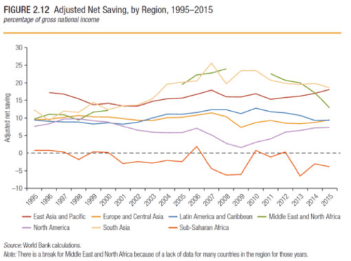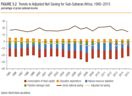 In haar laatste wereldwijde onderzoek (met gegevens over 1990-2015) concludeert de Bank dat Sub-Sahara Afrika jaarlijks ongeveer $ 100 miljard ANS verliest omdat het “de enige regio is met periodes van negatieve niveaus – gemiddeld een negatieve 3% van het BNI in het afgelopen decennium – suggererend dat zijn ontwikkelingsbeleid nog niet voldoende duurzame economische groei bevordert … Het is duidelijk dat de uitputting van natuurlijke hulpbronnen een van de belangrijkste oorzaken is van negatieve ANS in de regio.”