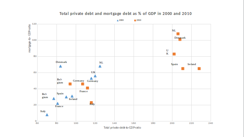 De eerste laat zien hoe private schuld (dus niet die van de financiële sector) als onderdeel van het BBP en dan zie je de verschuiving van het jaar 2000 naar 2010. Voor Nederland is het aandeel van hypotheekschulden in de private schuld heel hoog. Dat is in andere landen heel anders, in ontwikkelingslanden bijvoorbeeld zijn relatief veel minder hypotheekschulden en zijn andere types private schulden veel groter. Maar in 2000 stond Nederland in Europa al bovenaan, qua aandeel van het BBP, met zo’n 70 procent. Tien jaar later is het bijna verdubbeld, en nog steeds staan Nederland en Denemarken ver bovenaan en zitten ze boven de 100 procent. Landen als Duitsland en Frankrijk zijn bijna op hun plek gebleven en dus niet omhoog geschoten… (er wordt wat gediscussieerd over de verschillen tussen de landen, bijvoorbeeld Italië dat bijna geen particuliere hypotheekschulden heeft, mensen bezitten daar wel huizen maar hypotheekvrij).