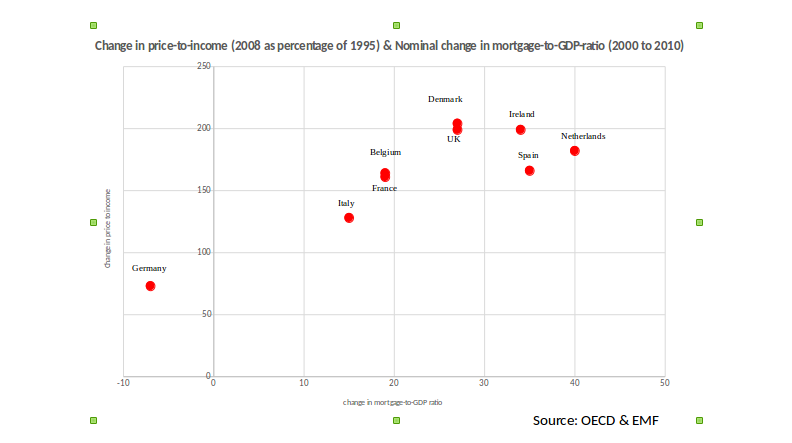 De tweede grafiek laat de verandering van hypotheken ten opzichte van het BBP (tussen 2000 en 2010). ook daar zie je Nederland er uit steken met veertig procent. Duitsland is zelfs negatief, dat wil zeggen dat in die periode het aandeel van hypotheken in het BBP is verminderd. De andere as van de grafiek laat de prijzen van gemiddelde koopwoningen zien ten opzicht van het inkomen (price to income ratio). Het is duidelijk dat de landen waar de prijzen het meest zijn gestegen, ook de landen zijn waar de schulden het hoogst zijn (Denemarken, UK, Nederland en Ierland). de cijfers lopen maar tot 2010 maar het is er de afgelopen 9 jaar bepaald niet beter op geworden.