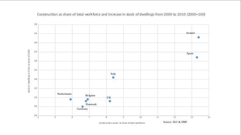 De laatste grafiek: we moeten niet vergeten dat Spanje en Ierland heel erg afwijken. Als het gaat om schulden lijken die erg op Nederland en Denemarken. Maar als je kijkt hoe het er uitziet ‘op de grond’, dan is het een totaal andere huizenzeepbel geweest, namelijk in Spanje en Ierland ging het om uitbreiding van het aantal woningen; in het geval van Spanje is de hele kustlijn volgebouwd. In Ierland ging het nog om daadwerkelijke woningen voor mensen, niet om 2e of 3e huisjes op mooie plekken waar je dan vliegvelden gaat aanleggen. Maar wat je hier ziet is ‘construction’, de bouwsector als percentage van de totale arbeidsmarkt. Wat je ziet is dat in de periode dat er echt een ‘boom’ was in Spanje en Ierland, dat de bouwsector daar meer dan 2 x zo groot was als in andere ontwikkelde economien. Die bouwsector was echt een sector waar de economie op dreef. het vliegwieleffect is dan veel sterker dan als je alleen een schuldgedreven model hebt gebaseerd op hypotheken van bestaande woningen. Daar creëer je een vliegwieleffect mee voor meer bestedingen maar dat effect wordt nog veel sterker als dat ook nog eens leidt tot dat je meer mensen aan het werk zet in die sector. In het geval van Spanje heeft het ook nog eens geleid tot een enorme influx van mensen van buiten Spanje om in die sector te gaan werken. Dat is eigenlijk alleen maar te vergelijken met wat er in China is gebeurd. Dat is van een andere orde dan wat er in Nederland en Denemarken gebeurde, waar de bouwsector relatief klein is, als het gaat om werkgelegenheid en waar het vooral gaat om schulden pompen in bestaande woningen. Dat is belangrijk in verband met de discussie die we nu hebben over bouwen bouwen bouwen, alsof dat de enige oplossing zou zijn. Als je ‘bouwen, bouwen bouwen’ doet, dan kun je dus ook dit krijgen.
