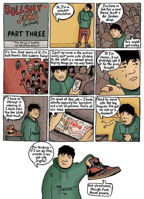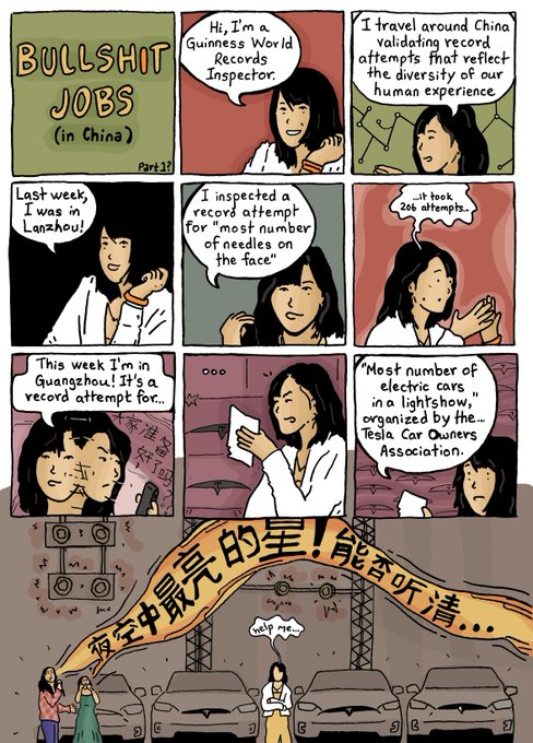 (Illustraties van Krish Raghav, die een hele serie strips over bullshit jobs in China heeft gemaakt)