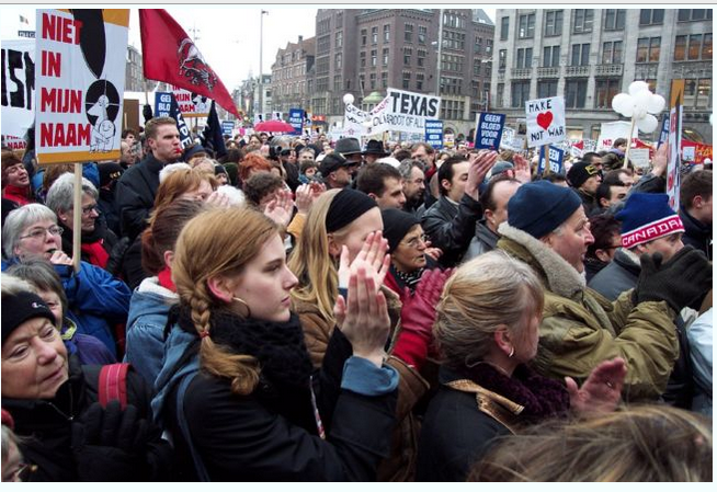 Toen Bush niet tevreden was met alleen Afghanistan aan puin te gooien, begon hij met voorsorteren op een aanval op Irak. U weet, vanwege die massavernietigingswapens die geheel uit de duim waren gezogen. De hele wereld ziet ook dat drama aankomen en begint te mobiliseren. In Nederland demonstreren op 15 Februari 2003 zo’n 80.000 mensen tegen de aanval op Irak. De massale opkomst verrast vriend en vijand. Zie hier de foto’s van Boyd. Zelfs de organisatoren hadden de mogelijke opkomst enkele tientallen duizenden mensen lager ingeschat. Maar ze liepen er echt. Het vermocht niet te helpen. De ‘War on Terror’ moest en zou doorgaan. We weten nu wat die opgeleverd heeft.