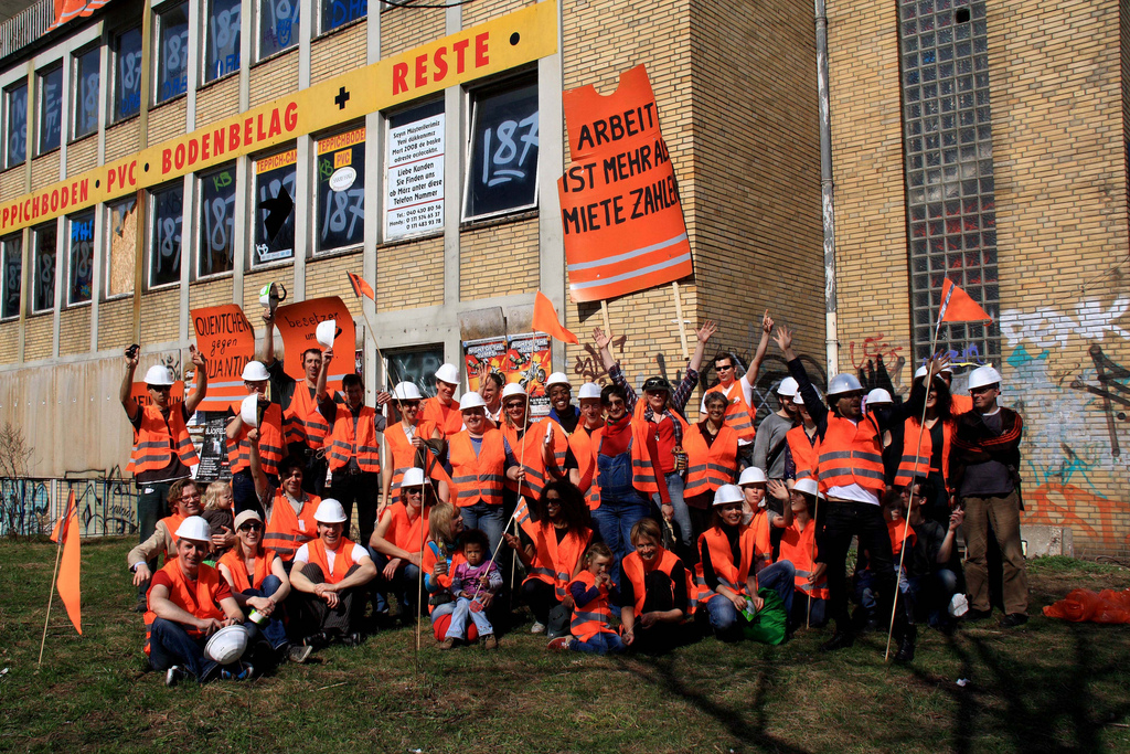 Lena: Om te beginnen omvat het ‘Recht op stad’ netwerk een veelvoud aan initiatieven – van het ‘Gängeviertel’ [een wijk die momenteel ‘opgeknapt’ wordt een waar sinds 2 jaar kraakacties plaatsvinden] en de ‘Rote Flora’ [een sociaal centrum in het Hamburgse Schanzenviertel dat 22 jaar geleden gekraakt is] tot de ‘Schreberspacken’ [een initiatief voor het behoud van volkstuinen in Hamburg Altona]. En de politieke stellingnames zijn net zo divers als deze verscheidenheid aan aangesloten groepen. Deze ervaringen hebben we vooral opgedaan als onderdeel van EuroMayday Hamburg [een breed netwerk dat elke jaar een 1 mei demonstratie organiseert] en binnen het initiatief Lux & Konsorten.