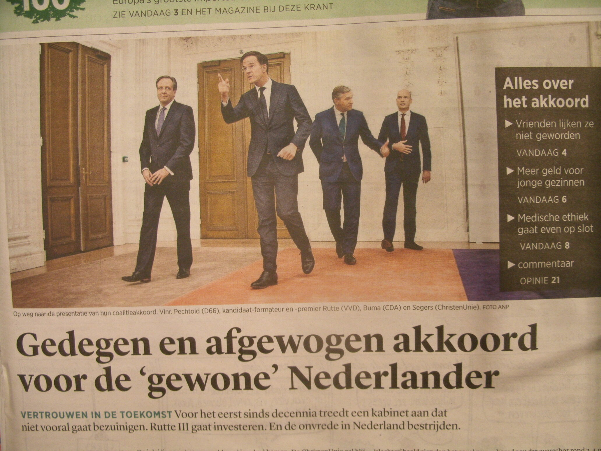 Een regering als stadhouder van de ondernemers. Geen vertrouwen in de toekomst die Rutte belooft. Regeerakkoorden worden gesloten tussen politieke partijen om de bevolking mee te delen hoe zij met contracten van plan zijn hun wensen te realiseren. Het zijn overeenkomsten tussen bureaucraten die enige tijd stadhouder mogen zijn voor de ondernemers. Het is een gedegen en afgewogen akkoord voor de ‘gewone’ Nederlander, schrijft het dagblad Trouw op 11 oktober jongstleden.