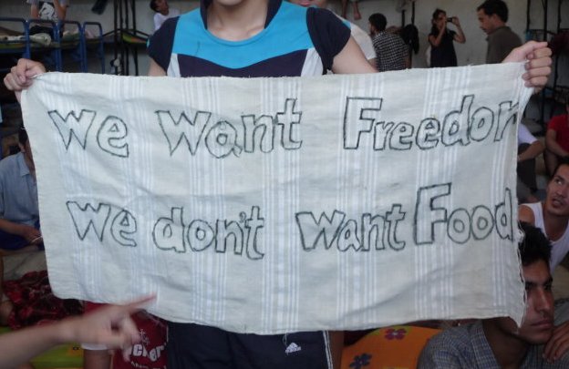 Want daar ontmoetten noborder activisten, die het grensbeleid van de EU wilden bestrijden, degenen die dat in de praktijk ondergraven door hun reis naar Europa. Bij het Informatiepunt lukte de communicatie ongeacht alle taalgrenzen – van onderlinge steun tot het gemeenschappelijke (politieke!) doen. De gaarkeuken bracht het eten, camp activisten boden medische eerste hulp, juridisch advies en praktische hulp voor de (door)reis aan. Migranten met meer ervaring vertaalden en deelden hun belevenissen, degenen die genoeg geslapen hadden hielpen de nieuwkomers. Migranten die net het eiland bereikt hadden, namen deel aan een afscheidsfeest voor degenen die met de veerboot naar Athene vertrokken. Een Afghaanse grootfamilie is het gelukt zich te registreren zonder eerst opgesloten te worden, een precedent! En voor de Frontex actiedag werd bij de Informatiepunt een enorm meertalig spandoek met tekst Freedom of Movement gemaakt door verschillende vluchtelingen. De verhouding tussen hulpverlening en activisme, tussen onderhandelingen en straatacties was niet makkelijk uit te balanceren en bracht deelnemers elke keer opnieuw aan hun emotionele en fysieke limiet. Maar juist dit proces lijkt ons een van de sterkste elementen van het camp.