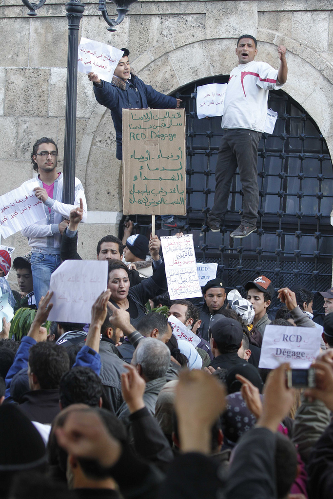 (foto Nassr Nouri: Tunis, 21 januari: Demonstranten roepen leuzen voor het huis van president Zine al-Abidine Ben Ali)