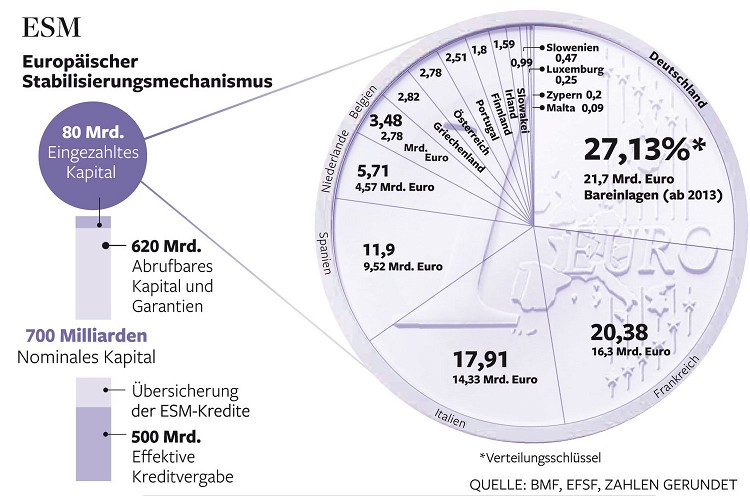 Het kapitaal zal 700 miljard euro bedragen. Hoe economisch sterker een land hoe meer aandelen het moet nemen . De twee zwaarste aandeelhouders zijn Duitsland ( 27%) en Frankrijk (20,5%), gevolgd door Italië (18%), Spanje (12%), Nederland (5,5%). De twaalf andere aandeelhouders bezitten tussen 3,5% (België) en 0,07% (Malta) van het kapitaal.