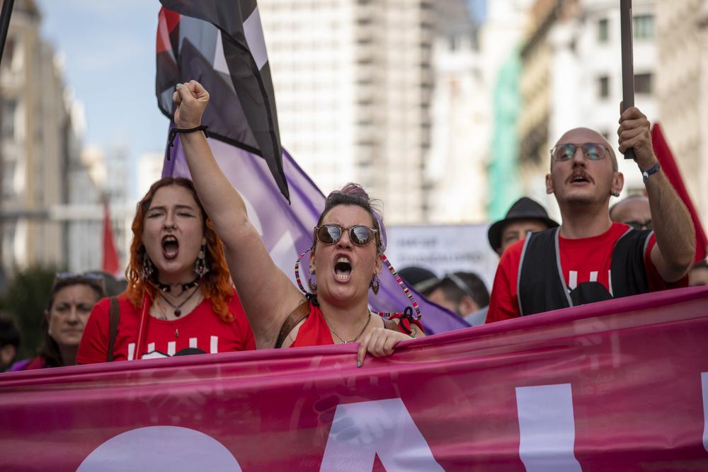 De vakbond CNT heeft in Madrid 10.000 mensen bijeengebracht om te protesteren tegen het lot van de zes vakbondsleden van de CNT uit Gijón die zijn veroordeeld tot drieënhalf jaar gevangenisstraf en 150.000 euro boete voor hun deelname aan een campagne ter ondersteuning van een medewerkster van de banketbakkerij La Suiza in Gijón. In de loop van de demonstratie werden de steunbetuigingen voortdurend herhaald: “Er is geen recht omdat wij ervan beschuldigd worden de rechten van de vrouw op het werk te hebben verdedigd”. “Oneindige dank aan hen die de straten van Madrid vulden.” “Wanneer kracht afneemt, is solidariteit opnieuw essentieel gebleken.” Dit zijn enkele van de getuigenissen op deze dag van strijd waarop de arbeidersklasse de straten van de hoofdstad heeft gevuld. Met één stem, één boodschap: “Noch de staat, noch de werkgevers begrijpen dat we er niet alleen voor staan. Solidariteit is wat de arbeidersklasse bijeenhoudt”.