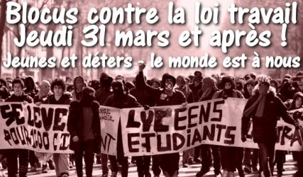 Oproep van de Mouvement Inter Luttes Indépendant (Mili) (Onafhankelijke Beweging Overkoepelende Strijd). We nemen de straat en laten die niet meer los, donderdag 31 maart, scholieren, studenten, werklozen, arbeiders (m/v), laten we alles blokkeren tegen de arbeidswet.