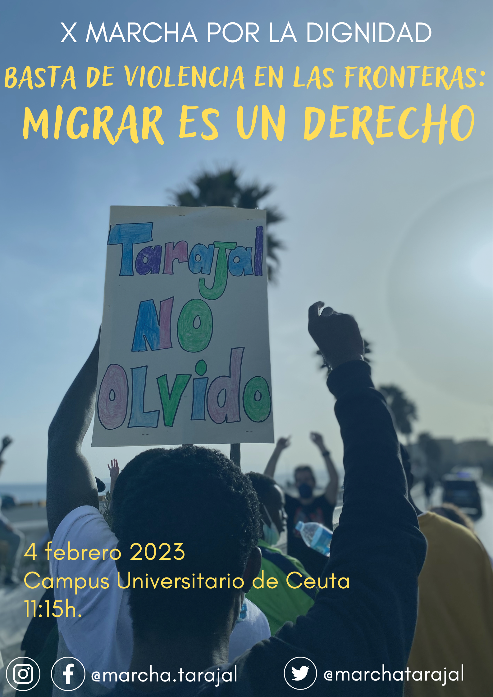 De 10e MARCH FOR DIGNITY is een activiteit ter nagedachtenis aan de mensen wier leven werd genomen op de ochtend van 6 februari 2014 op het strand van Tarajal, maar het is ook een aanklacht voor alle mensen die zijn gestorven en sterven tijdens hun migratieproces, zij die nog steeds wachten op de kans om Europa te bereiken, zij die worden teruggestuurd in het heetst van de strijd, zij die worden gediscrimineerd, uitgesloten, gecriminaliseerd, opgesloten, vernederd, uitgebuit, geprostitueerd, tot slaaf gemaakt, afgeperst, onzichtbaar gemaakt.
