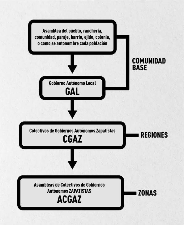 TEN EERSTE. – De belangrijkste basis, die niet alleen de autonomie in stand houdt, maar zonder welke ook de andere structuren niet kunnen functioneren, is de Lokale Autonome Overheid, Gobierno Autónomo Local (GAL). Er is een GAL in elke gemeenschap waar er Zapatista steunpunten zijn. De Zapatista GAL’s zijn de kern van alle autonomie. Ze worden gecoördineerd door de autonome agenten en commissariaten en zijn onderworpen aan de vergadering van het dorp, de ranchería, de gemeenschap, de paraje, de barrio, de ejido, de colonia, of hoe elke bevolkingsgroep zichzelf ook noemt. Elke GAL controleert zelf zijn autonome organisatorische middelen (zoals scholen en klinieken) en de relatie met naburige niet-Zapatistische zuster-pueblos. En het controleert het goede gebruik van de fondsen. Ze spoort ook wanbeheer, corruptie en fouten op en stelt deze aan de kaak. En het is alert op diegenen die zich willen voordoen als Zapatistische autoriteiten om steun of hulp te vragen die ze voor eigen gewin gebruiken. Dus als er eerst een paar dozijn MAREZ’s waren, d.w.z. Zapatista Autonome Opstandige Gemeenten, dan zijn er nu duizenden Zapatista GAL’s.