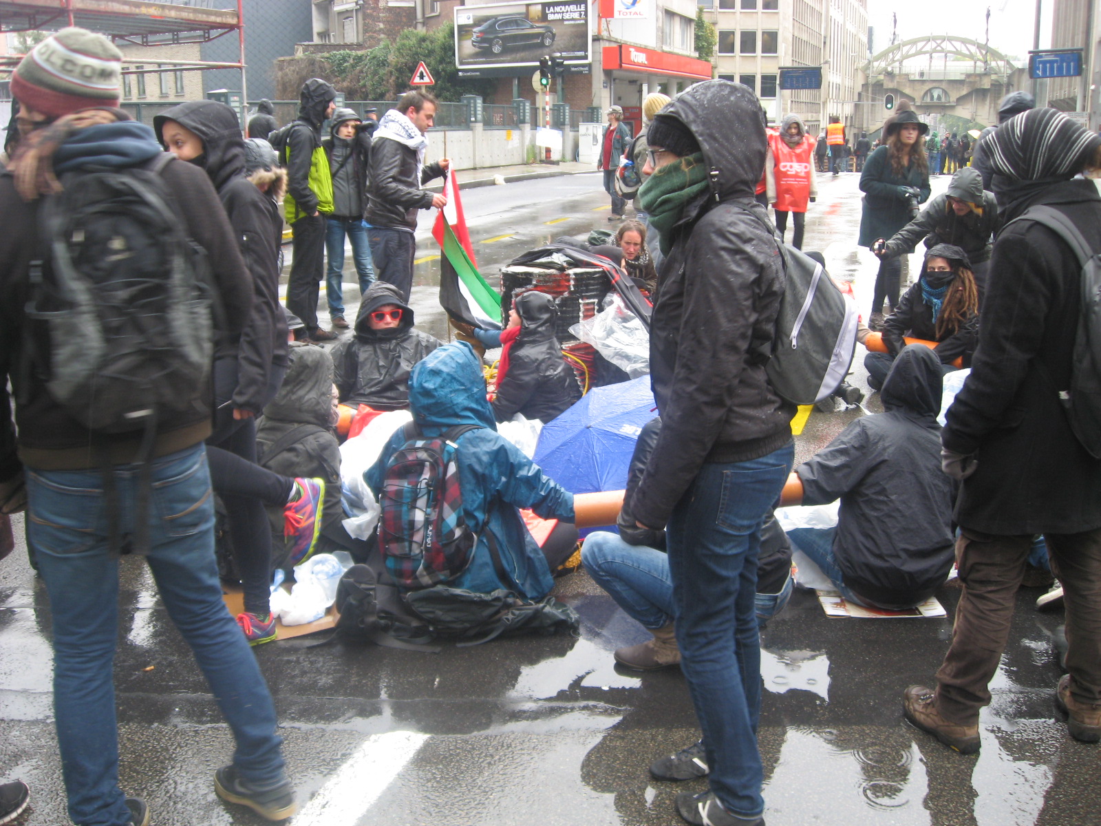 Ondertussen speelden zich bij het hoofdpodium ontroerende taferelen af. De lange-afstandlopers van de Euromarsen kwamen aan en werden juichend en met muziek uit de musical les Miserables onthaald. Eerder was ook al een grote groep migranten en sympathisanten, met oranje zwemvesten aan, aangekomen en op het podium werden toespraken gehouden door allerlei vertegenwoordigers van sociale bewegingen, afgewisseld met muziekt. Het regende de hele dag, wat een beetje goedgemaakt werd door een vuur van pallets midden op de weg. Elders waren barricades soms opgehoogd met bouwmateriaal en stonden vakbonden broodjes uit te delen.