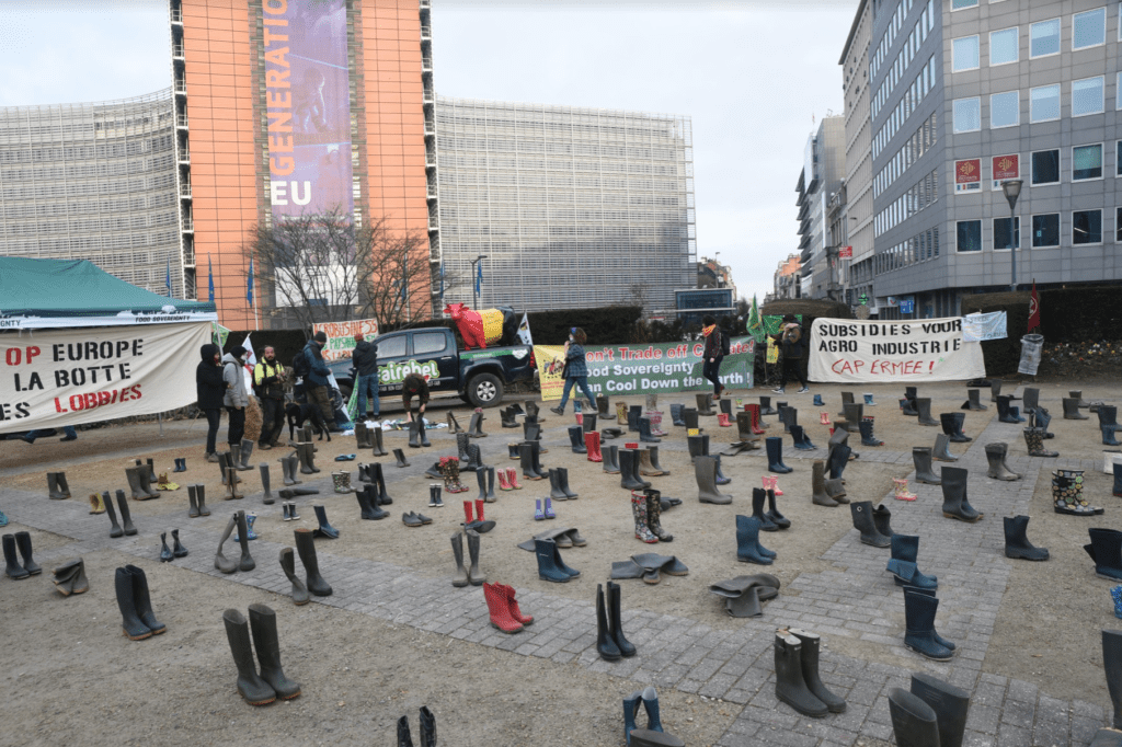 Het netwerk ter ondersteuning van de boerenlandbouw (RéSAP), Voedsel Anders, Agroecology in Action, Youth for Climate en een vijftiental andere organisaties kwamen in Brussel bijeen om het gebrek aan samenhang tussen het landbouw-, handels- en milieubeleid van de Europese Unie aan te klagen. Meer dan 200 paar laarzen werden neergezet voor de Europese Commissie. Ze staan symbool voor de boerderijen die de afgelopen jaren massaal zijn verdwenen in België. Sinds 2009 verloor Vlaanderen gemiddeld 12 landbouwbedrijven per week.[1] Het zijn vooral de kleine bedrijven die moeten stoppen zodat er een voortdurende schaalvergroting plaatsvindt [2]. Voor de beweging is dit niet minder dan een sociale en ecologische noodsituatie.