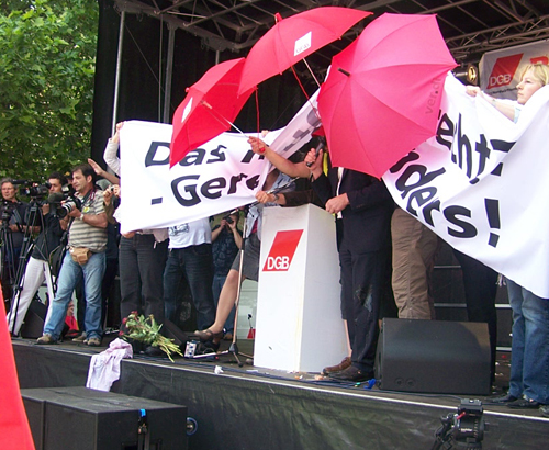 In Stuttgart gingen zo’n 15.000 mensen de straat op, waarvan 500 zich in een ‘anti-kapitalistisch blok’ hadden verenigd. Grote commotie ontstond toen een hoge SPD-er, Claus Schmiedel, aanstalten maakte om vanaf het podium de menigte toe te spreken en eerst luid uitgejoeld werd en later met eieren en andere voorwerpen bestookt werd door mensen die kennelijk niet waren vergeten hoe de SPD eerder samen met de Grunen begonnen was met bezuinigen en afbreken van sociale voorzieningen. Politie ging hand in hand met ordebewaarders van de vakbond tegen de demonstranten tekeer en moest de spreker op het podium beschermen (verslag) foto’s (filmpje)