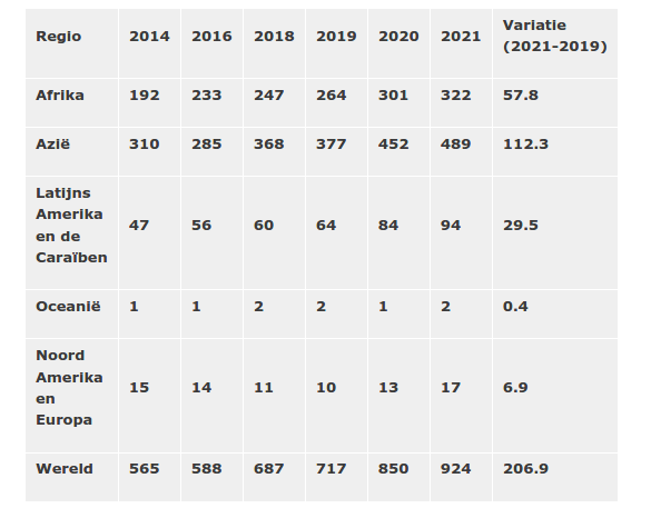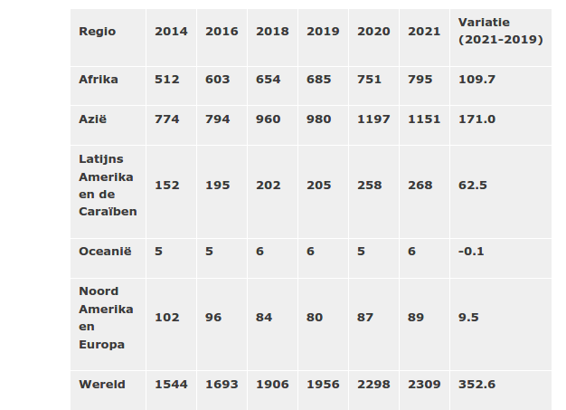 Wereldwijd is het aantal mensen met ernstige voedselonzekerheid tussen 2014 en 2021 met meer dan 350 miljoen toegenomen, van 565 tot 924 miljoen.