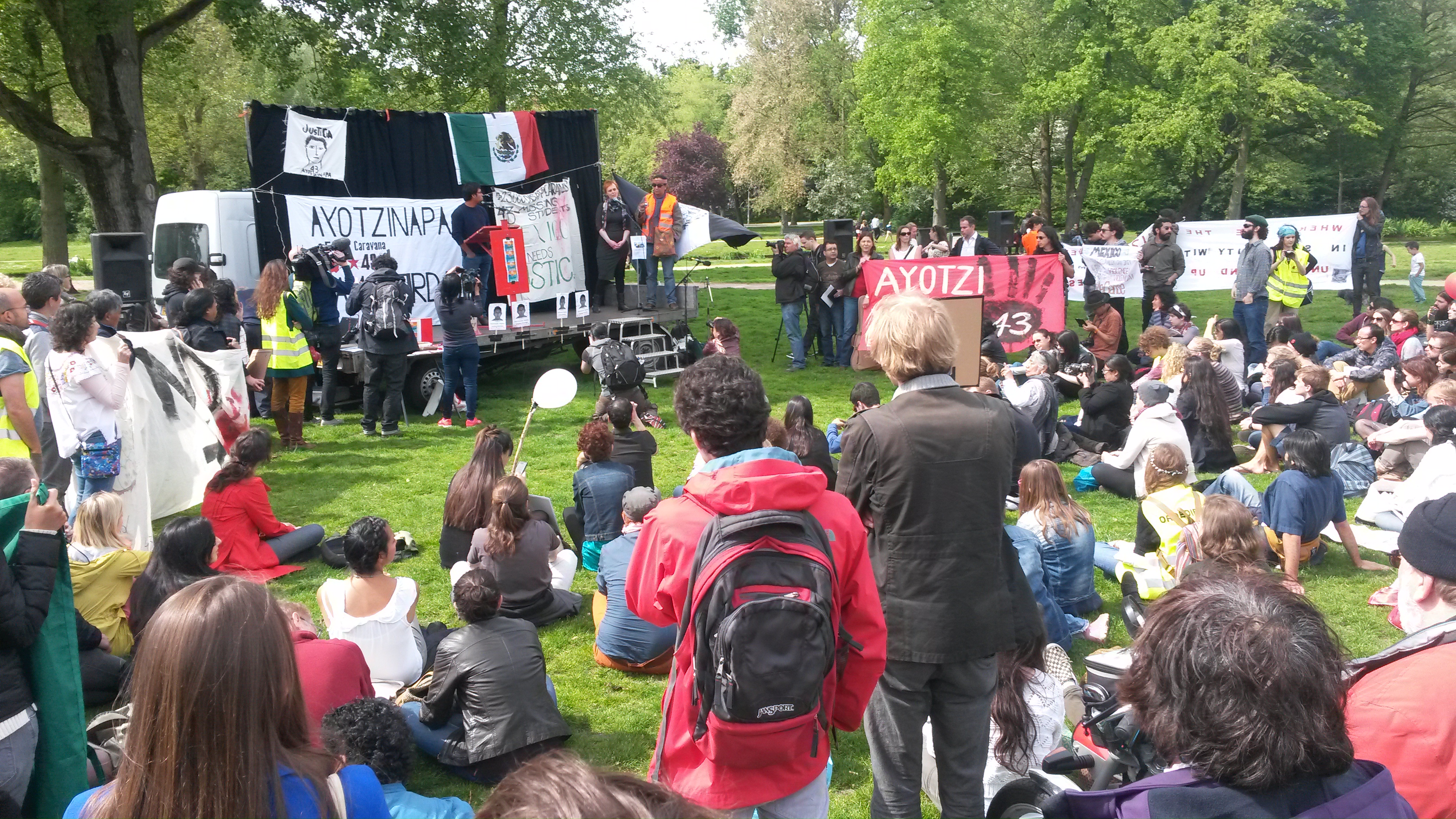 Afgelopen zondag 18 mei was er een kleine demonstratie met een indrukwekkende afsluitende manifestatie in het Amsterdamse Vondelpark, voor de verdwenen studenten van Ayotzinapa (Guerrero, Mexico). De strijd voor terugkeer van de verdwenen studenten (en daarachter de meer dan 30.000 andere verdwenenen in Mexico) wordt met dergelijke acties voortgezet.