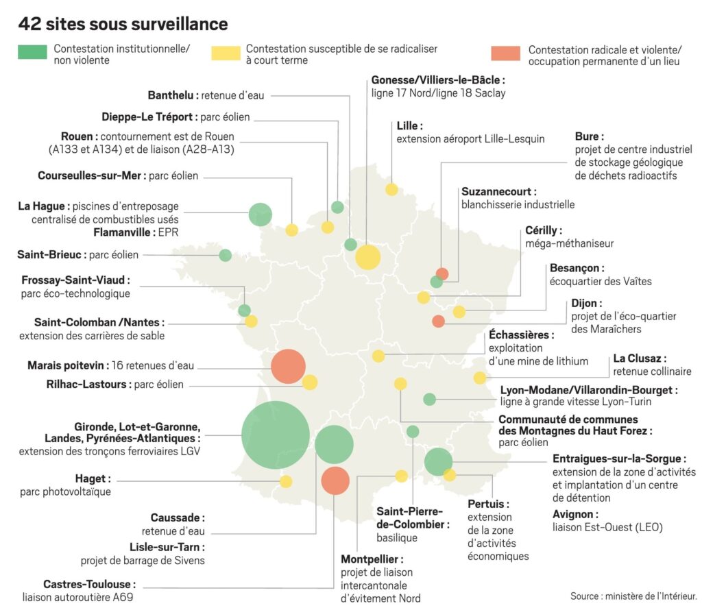 In werkelijkheid, gelet op de kaart van de 42 “onder toezicht staande gebieden” die de JDD op basis van de inlichtingendiensten aanbiedt, is het de hele levende ecologische strijd van dit land – tegen nutteloze en ecocidale projecten voor snelwegen, uitbreiding van luchthavens, lithiummijnen, megabassins, betonnering van volkstuinen – die deze regering probeert te muilkorven. Haar “anti-zad” cel en wat er werkelijk onder valt is een oorlogsverklaring aan de ecologische en boerenbeweging als geheel, aan de bewoners van de gebieden die ermee te maken hebben.
