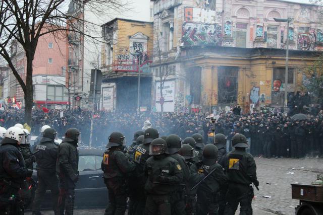 Het politie-optreden op 21 december was zelfs voor Duitse verhoudingen verbluffend: de demonstratie werd vanaf het begin omsingeld en aangevallen, waarna flinke confrontaties plaatsvonden en ook elders in de stad schermutselingen geschiedden. Maar minstens zo opvallend waren de maatregelen erna. Een flink deel van de binnenstad werd tot ‘Gefahrengebiet’ uitgeroepen, waarmee een soort permanente noodtoestand ingesteld werd. De reacties van activisten en andere bewoners was geweldig; ze gingen massaal de meest hilarische acties in het ‘Gefahrengebiet’ voeren. Even wat feiten en links op een rijtje:
