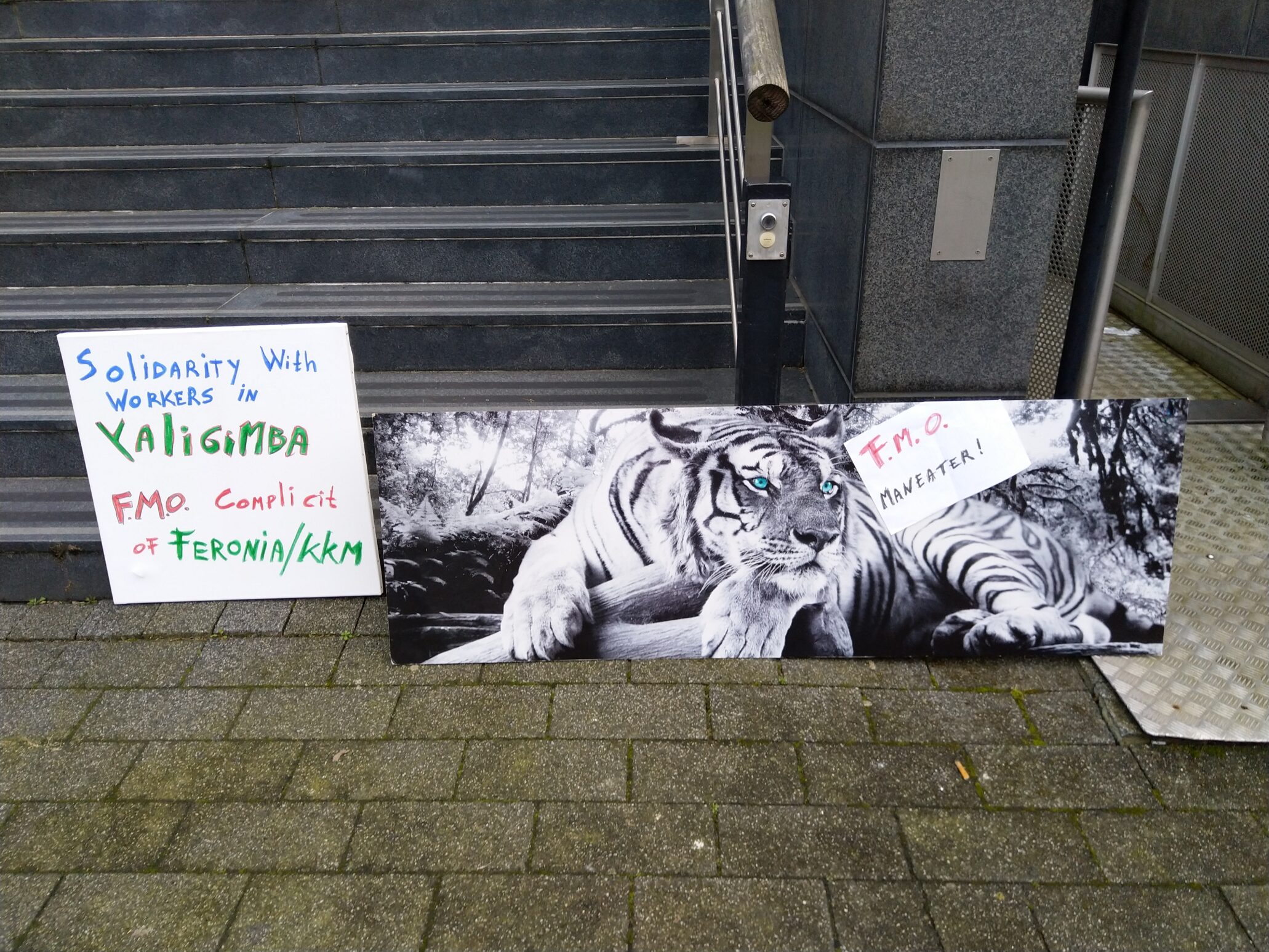 Op een van de plantages (Yalingimba) was een staking gaande ten tijde van onze presentatie om achterstallig loon van arbeiders op de plantage en vandaar dat we hun strijd een hart onder de riem wilden steken door een foto voor het gebouw van de FMO te maken (daarover verderop meer).