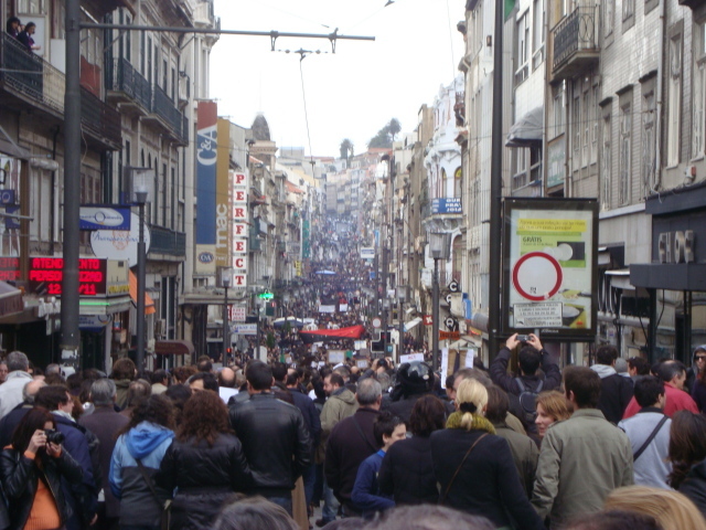 Wat betreft het oordeel over deelname aan sociale protesten, moet dat sinds 12 maart 2011 anders luiden. De initiatiefnemers waren geen partijen of vakbonden, maar ‘precaire ongeorganiseerden’. En desondanks, of misschien wel daarom, demonstreerden op die dag meer dan 200.000 mensen in Portugal tegen de toenemende precarisering van hun levensomstandigheden, door werkloosheid of daling van lonen. Alleen in Porto waren al zo’n 80.000 mensen op straat – terwijl er zo’n 400.000 mensen wonen. In Porto waren vlaggen van partijen even afwezig als symbolen van vakbonden. Naast veel zelf gefröbelde borden en een paar Portugese vlaggen, waren voornamelijk spandoeken van de anarchosyndicalistische AIT-SP te zien.
