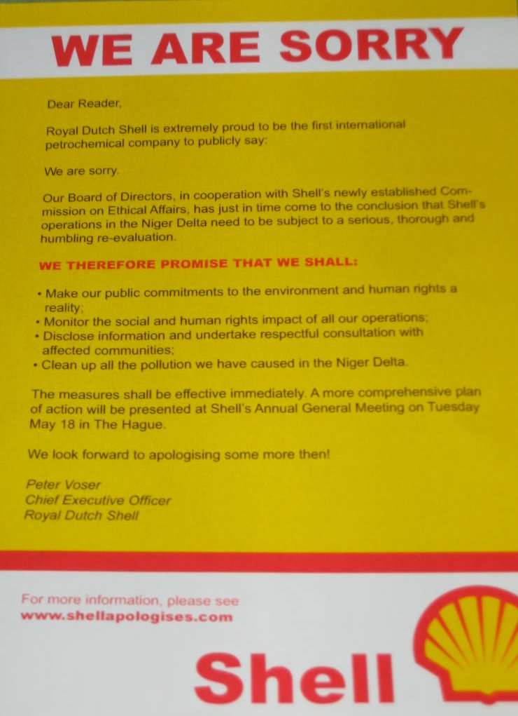 Royal Dutch Shell zegt erg trots te zijn, omdat het de eerste internationale petrochemische industrie is die publiekelijk aangeeft spijt te hebben.
