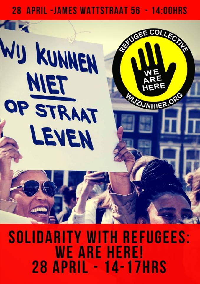 Wij gaan daarom zaterdag 28 april de straat op om onze solidariteit te betuigen met Wij Zijn Hier. De gentrificatie van onze stad en de haat richting vluchtelingen moet een halt worden toegeroepen. Iedereen in Amsterdam heeft recht op onderdak, zorg, onderwijs en werk, ook als mensen niet de juist papieren hebben!