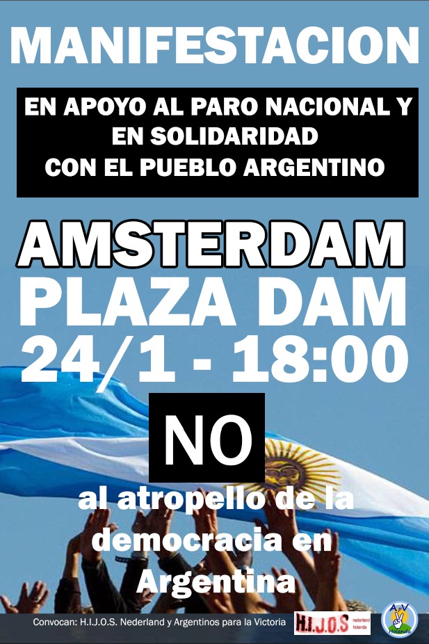 Kom daarom daar onze solidariteitsmanifestatie op woensdag 24 januari om 12.00 uur bij de ambassade van Argentinië, Javastraat 20, Den Haag. Om 18.00 uur vindt er nog een manifestatie op de Dam in Amsterdam plaats, mede-georganiseerd door de Argentijnse Diaspora. FNV Grenzeloos Solidair!