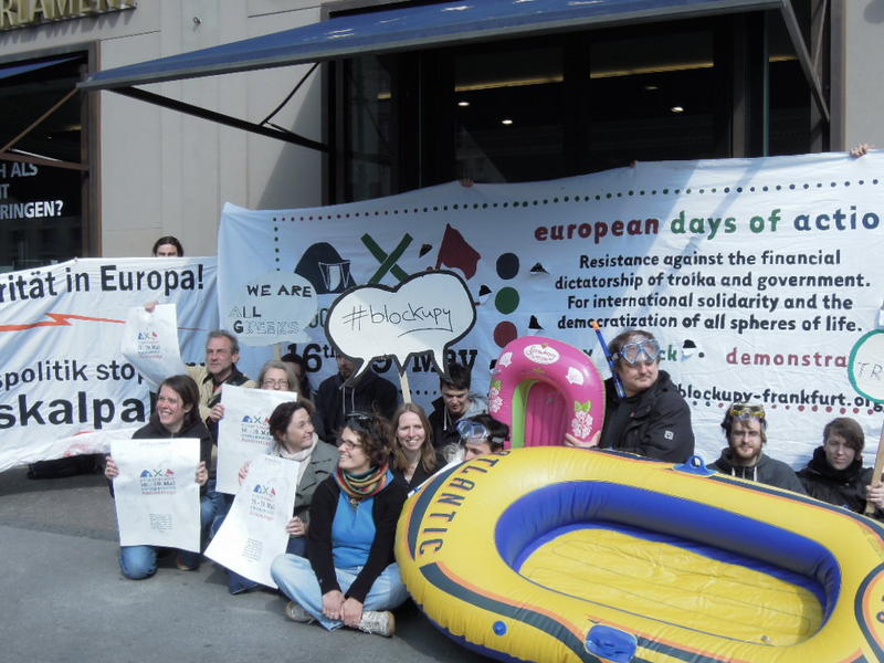 Vanwege de prominente rol van de ECB bij het crisisbeleid, die zijn zetel in Frankfurt heeft, ligt het voor de hand daar ons verzet heen te brengen. De organisatoren benadrukken dat ze zich richten tegen de hele ’trojka’ (de driekopsmacht: IMF, EU en ECB) die steeds meer macht in handen krijgt. Op vrijdag 18 mei zal geprobeerd worden de gebouwen van de ECB te blokkeren. Maar het is dan de bedoeling om het hele zakendistrict lam te leggen; veel transnationale banken en bedrijven hebben kantoren in de Frankfurtse binnenstad. Zo ook bijvoorbeeld Randstad, ABN-Amro en ING.