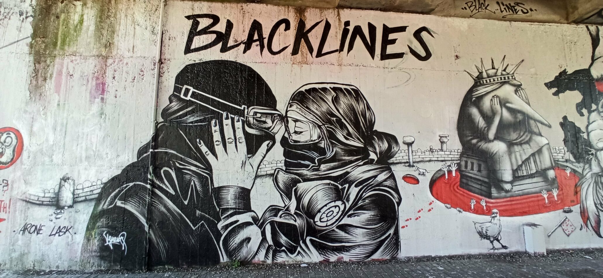 De demonstratiedoeken en muurschilderingen zijn populair. Ze hebben zo ‘n 80 grote doeken voor demonstraties gemaakt, waarvan er minstens 50 door de politie in beslag zijn genomen of vernield. Tegenwoordig richten de politie-acties zich ook speciaal op de spandoeken, die als trofeeën in beslag genomen worden. Er zijn hele series van dat politie-eenheden trots achter een Black Lines spandoek staat te poseren.