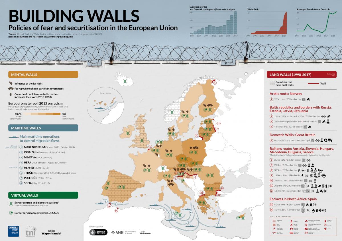 Het rapport onderzoekt de verschillende muren die de afgelopen jaren in Europa zijn opgebouwd, inclusief maritieme muren, zoals Frontex-operaties op de Middellandse Zee. Van de acht maritieme operaties heeft geen enkele het redden van mensen als voornaamste doel :allen richten zich op het tegenhouden van vluchtelingen.