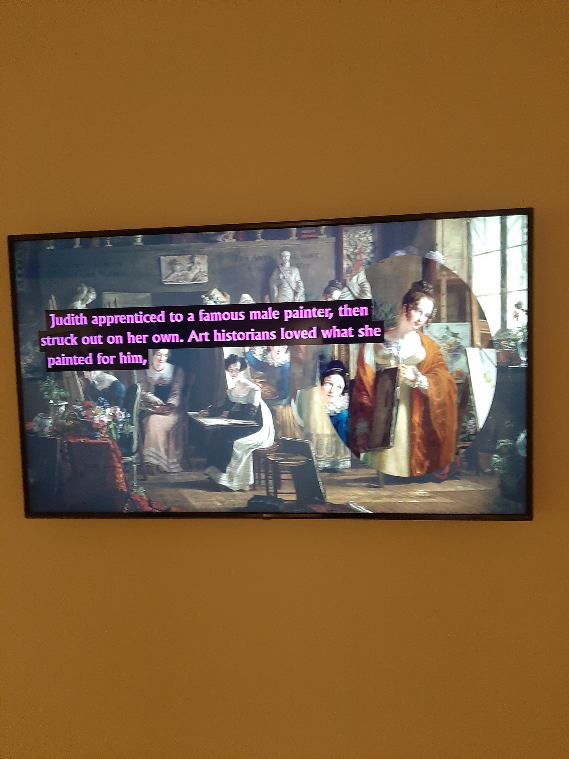 Er hangt/staat sowieso veel kunst van en over vrouwen. Waaronder de bekende Guerrilla Girls, met een spandoek dat al vaak vertoond is, maar ook een video over de specifieke Nederlandse praktijk om vrouwen buiten de kunst te houden, zoals tijdens de Gouden Eeuw. Ze konden natuurlijk even goed schilderen als de gouden mannen, maar mochten het niet.