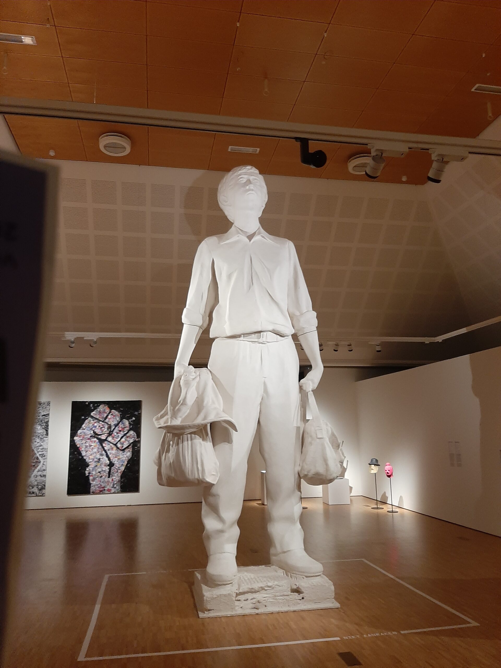 Meteen na de ingang stuit je op een reusachtig standbeeld van een man met twee boodschappentassen. Het is de man die in China in zijn eentje een colonne tanks tegenhield van het leger dat op weg was naar Tienanmen plein om de studenten daar te verjagen (gemaakt door Fernando Sánchez Castillo, die ook al een barricade als kunstwerk maakte waarover we eerder schreven)