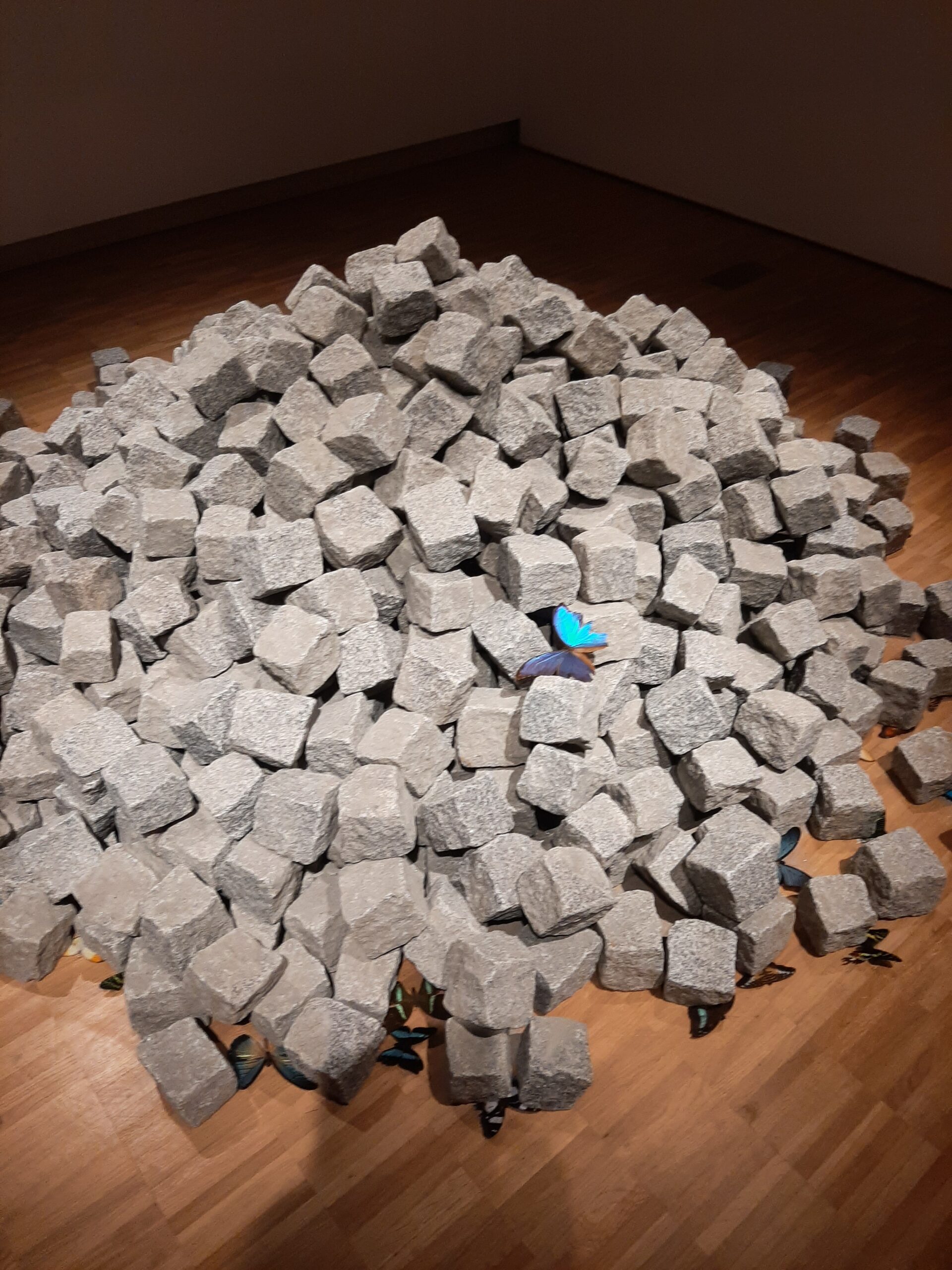Daarna zie je een stapel straatstenen, van die kleine handzame die als munitie dienen bij een goeie rel. Maar de Peruaanse kunstenaar Jotas Castro heeft er vlinders tussen geplaatst. Die vliegen ook, wat lichter ook.