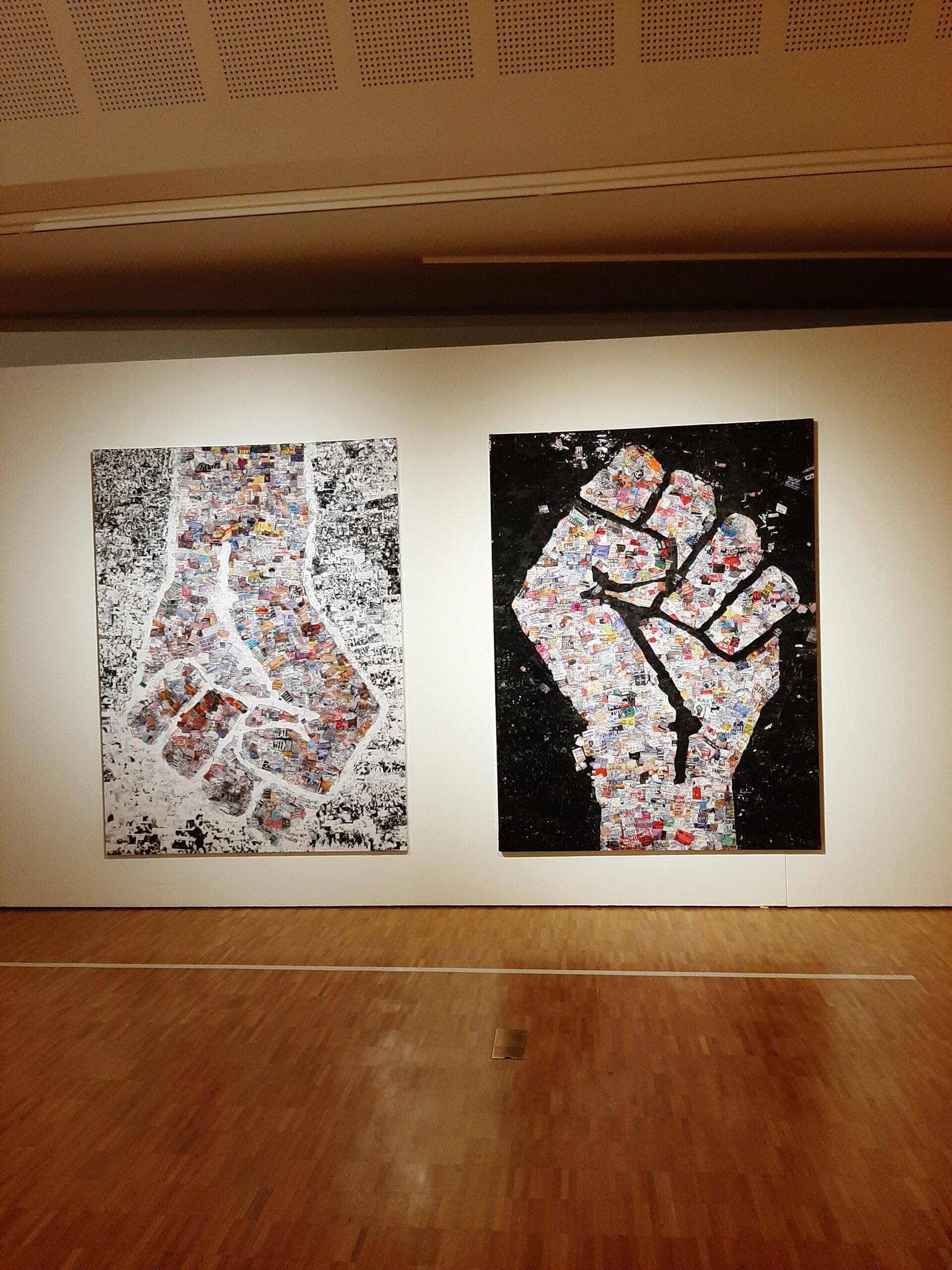 De ouderwetse revolutionaire iconografie van links is grotendeels afwezig, of dient hoofdzakelijk om commentaar op te geven. Er was welgeteld een stuk dat de gebalde vuist had gekozen, en wel heel groot, maar dichterbij bekeken bleek die geheel te bestaan uit een collage van duizenden foto’s van spandoeken die op demonstraties te zien waren geweest.