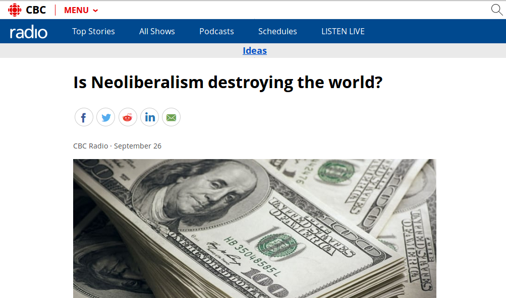 Het antwoord op deze prangende, en serieus bedoelde vraag, biedt de uitzending op de Canadese publieke zender CBC. Maar dan natuurlijk in het Engels, en dan luidt de vraag: Is Neoliberalism Destroying the World?