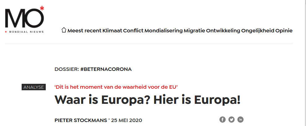 Recensies enzo MO*: Waar is (kritisch) Europa? Onder de titel “Waar is Europa? Hier is Europa!” publiceert Pieter Stockmans in MO* van 25 mei een beschouwing over het “moment van de waarheid”… Herman Michiel/Ander Europa 8 juni, 2020 · 5 min leestijd