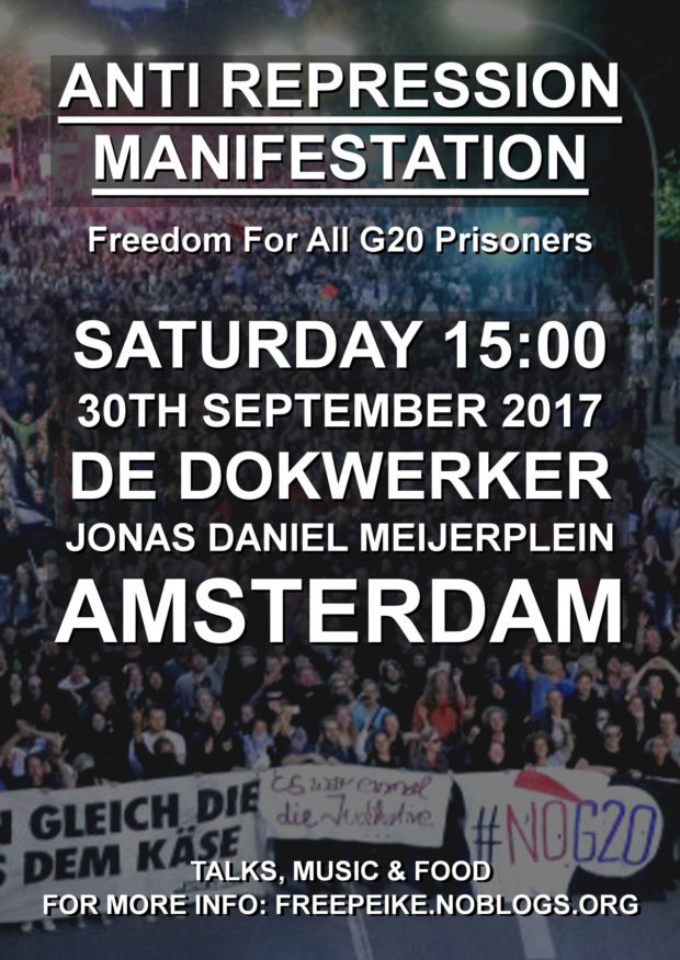 Nieuws G20: Anti Repressie Demonstratie (Amsterdam) G20-protesten en staatsrepressie. Solidariteit met Peike en andere gevangenen! G20 protest and state repression. Solidarity with Peike and other prisoners! Zaterdag 30 september 15.00 uur… Aankondiging 26 september, 2017 · 3 min leestijd