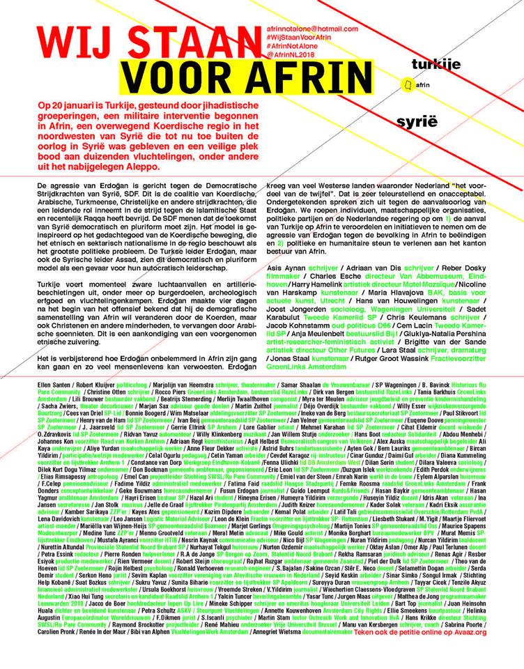 Nieuws Wij staan voor Afrin! Hieronder de tekst van een petitie op de petitie-website avaaz. Maar waarschuwing: petities veranderen op zich natuurlijk niets! We moeten ook acties en andere dingen… tekst petitie avaaz 23 februari, 2018 · 2 min leestijd