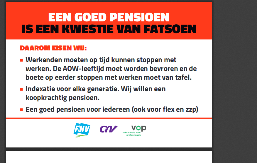Achtergrond Pensioenen, leve de vierde eis! De discussie, strijd en actie rond de pensioenen zijn begonnen met het idee om het stelsel te redden. Daartoe nam binnen de FNV een groep… Sjarrel Massop/Solidariteit.nl 21 januari, 2019 · 5 min leestijd