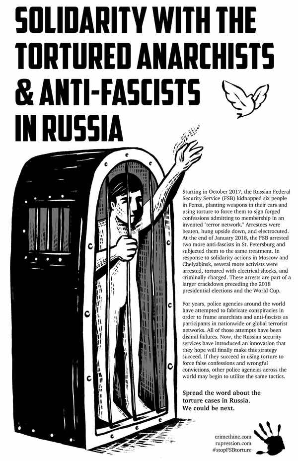 Nieuws Martelingen en verdwijning bij repressiegolf tegen anarchisten in Rusland In de vroege morgen van vrijdag 1 februari hield de FSB (Federale Veiligheidsdienst) in een aantal flats in Moskou huiszoekingen. Daarbij werden 10 mensen gearresteerd… Freedom News/Libcom/Tommy Ryan 4 februari, 2019 · 11 min leestijd