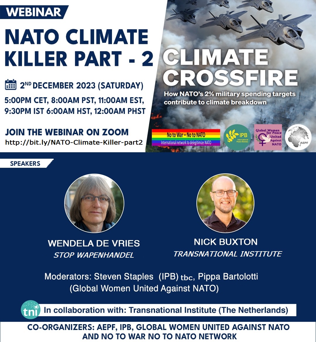 Nieuws Drie internationale online bijeenkomsten over bewapening, klimaatrechtvaardigheid en militarisme Online bijeenkomsten over wapenhandel en klimaat (2 december), Europees beleid (7 december) en de COP 28 milieuconferentie (8 december)… Stop Wapenhandel | website 30 november, 2023 · 3 min leestijd